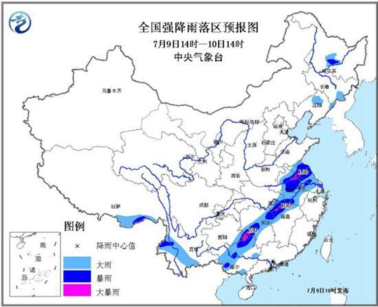 预计,7月9日14时至10日14时,江苏、安徽、湖北东南部、江西西北部、湖南西南部和东北部、贵州东南部、广西东北部和西南部、云南中西部、辽宁北部、黑龙江中部等地的部分地区有大雨或暴雨,其中,苏皖沿淮地区、湖北东南部、江西西北部、湖南西南部、广西东北部等地局地有大暴雨(100~160毫米);上述部分地区有短时强降水,局地伴有雷暴大风等强对流天气,最大小时雨强可达20~40毫米,局地超过60毫米。
