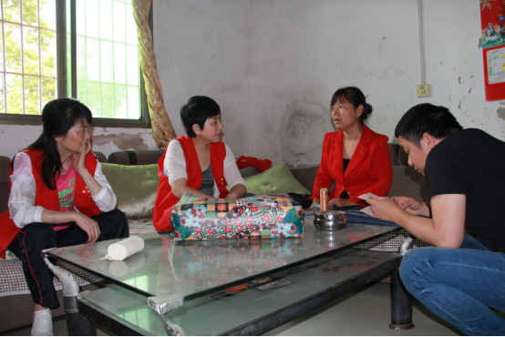 周红玲(左二)详细了解她的帮扶对象小晴(右二)的身体状况、就医情况,帮她联系医生,鼓励她坚定信心