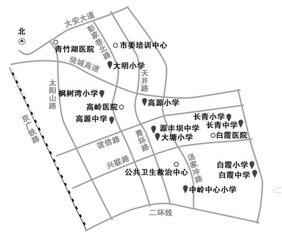 规划区内还有5所医院,分别为高岭医院、市委培训中心、青竹湖医院、公共卫生救治中心、白霞医院。其中,高岭医院位于枫树湾公园南侧,是规划新增医院,规划床位549个,面积近5万平方米。