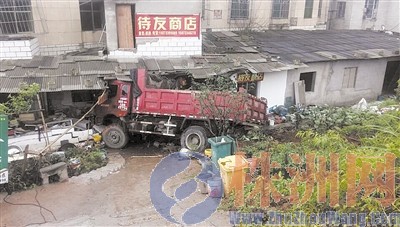 ▲昨天中午,货车冲下护坡,撞坏了民房 记者 成姣兰 摄