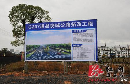 道县G207绕城公路拓改工程项目是道县2017年重点项目和城市建设的标志性工程,北起富塘街道五马归槽,经富塘街道富塘村、工业园工业大道、东州大道、潇水三桥、万家庄街道,南至厦蓉高速公路南枢纽互通连接线处,全长约13.37公里,道路宽60米,总投资约12亿元,计划工期2年。