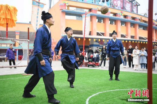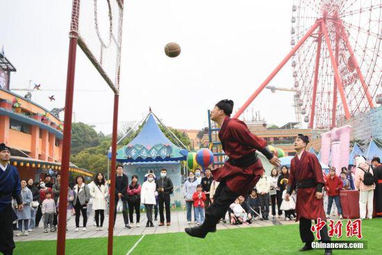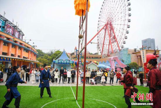 4月3日,湖南省长沙市世界之窗公园举行蹴鞠活动,以此方式还原古代清明节的传统习俗。 中新社记者 杨华峰 摄