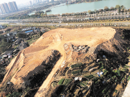 前日下午3时许,记者来到这个地方。渣土堆位于月湖小区一期的西北角,往北100多米就是月湖。这个渣土堆占地约有两三亩,远远看去,像是一座小山,高 出周边六七米,土坡下方长了草,可以看出已堆了很久,但上方新堆的渣土有两三米高。由于旁边没有采取任何围挡措施,有些渣土块滚到了下面的菜地里。