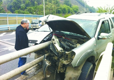 11月5日15时15分,一名头部受伤的男子在打电话报案。当天14时30分许,长沙市岳麓大道,牌号为湘A.UJ785的小车由西向东行驶到东方 红路口时,由于驾驶员取水喝,分散了注意力,车辆失控冲上路中央的隔离带,撞上立交桥的护栏,导致驾驶员的头部和右臂受轻伤,车辆严重损坏。 本报记 者 刘建光 摄