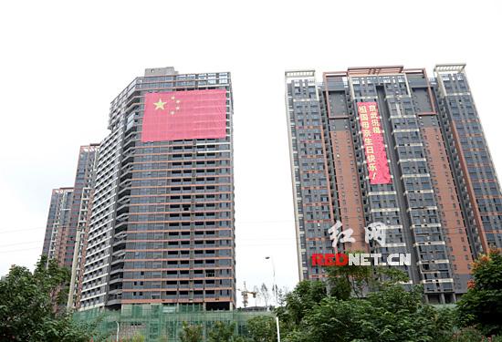 红网长沙10月1日讯(红网时刻新闻记者 李慧芳)“你看,那个房子上的国旗!巨大!”10月1日一早,从劳动路开车前往高铁站的廖女士和她先生注意到了沙湾公园地铁口京一小区楼顶的巨幅五星红旗。