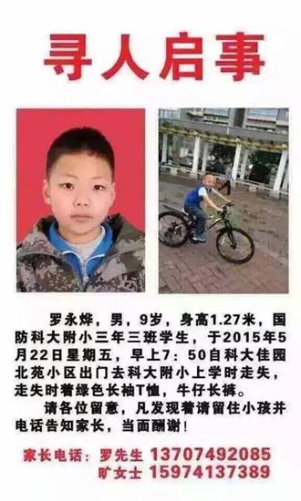 潇湘晨报长沙5月22日讯 5月22日,长沙人的微信朋友圈被一个叫罗永烨的9岁男孩刷屏:#寻人启事# 罗永烨,男,9岁,身高1.27米,国防科大附小三年三班学生,于2015年5月22日星期五,早上7:50自科大佳园北苑小区出门去科大附小上学时走失,走失时身着绿色长袖T恤、牛仔长裤。请各位家长留意,凡发现者请留住小孩并电话告知家长,老师。